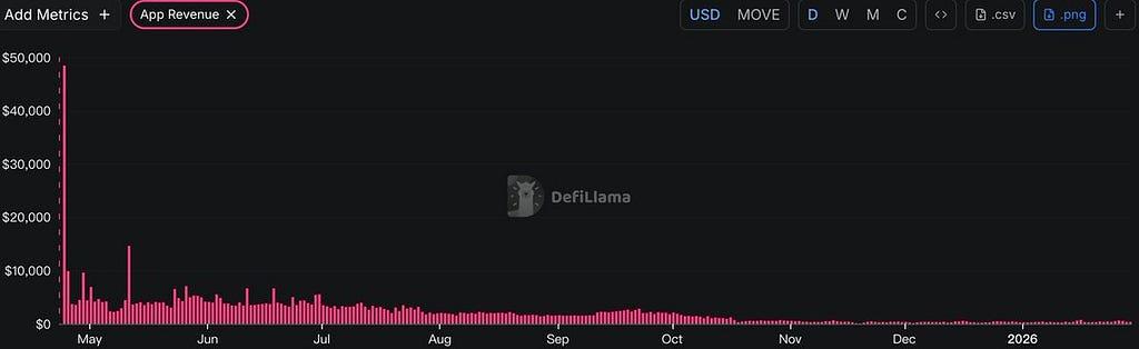 - 극도로 낮은 생태계 프로젝트 수익: Movement 플랫폼에 등록된 모든 애플리케이션의 일일 총 수익은 약 300달러에 불과하며 지속적으로 감소하고 있어 생태계가 붕괴 직전에 있음을 시사합니다.
