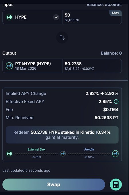 다행히 Pendle의 프런트엔드를 이용하면 Hype를 kHYPE-PT-19MAR26으로 직접 바꿀 수 있어서, 제가 잘못 실행한 부분을 완전히 숨길 수 있었습니다!