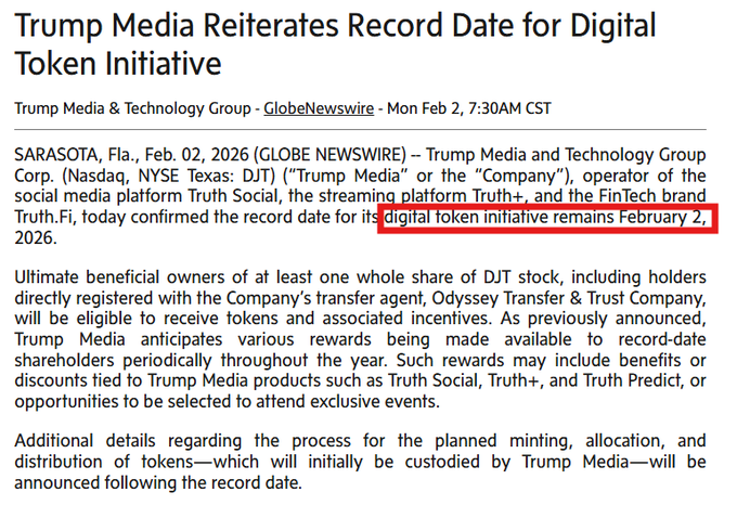 Says Feb 2nd 2026 is still the confirmed record date for the token launch.