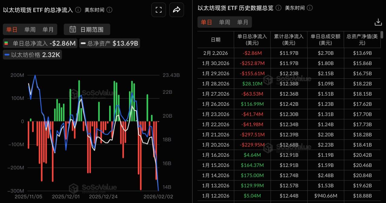 SoSoValue 데이터에 따르면 이더 현물 ETF는 어제(2월 2일, 미국 동부 시간) 총 285만 5,800달러의 순유출을 기록했습니다.