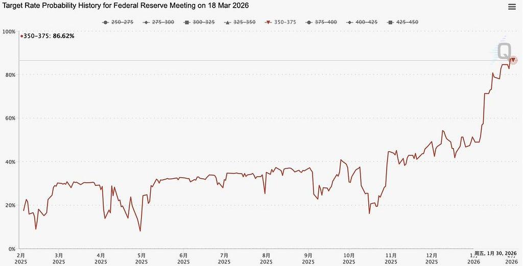 1️⃣ 금리: CME FedWatch 도구에 따르면 3월 금리가 3.50%~3.75%로 유지될 확률은 87.2%입니다. 이 금리 범위가 유지될 확률은 2025년 말 이후 급격히 상승하여 현재 약 90%에 육박합니다.