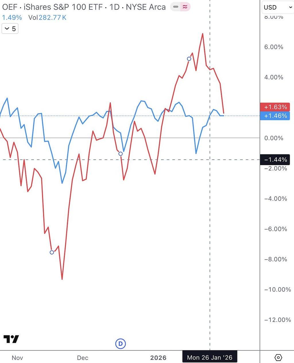 대형주 중심의 OEF(파란색 선)는 대형 기술주들이 모여들어 상승세를 보이면서 비교적 높은 수준을 유지하고 있습니다. 소형주 중심의 IWO(빨간색 선)는 이미 연초 이후 상승분을 모두 반납했습니다.