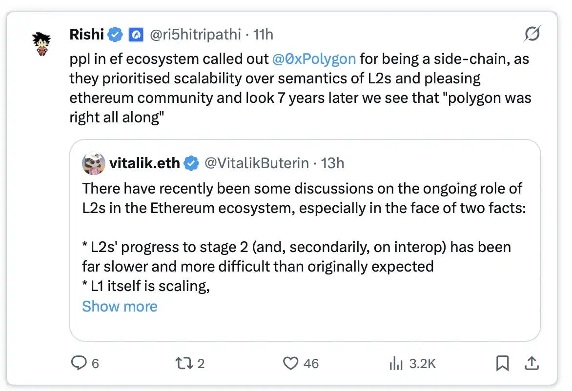 리시는 이더 생태계 내에서 폴리곤을 둘러싼 오랜 논란을 되짚어보았습니다. 초기에는 폴리곤이 "사이드체인"으로서 "정통적"이지 않다는 이유로 이더 커뮤니티 일부의 비판을 받았지만, 폴리곤은 L2 시맨틱이나 커뮤니티 이념에 얽매이기보다는 확장성 문제 해결을 우선시했습니다. 7년이 지난 지금, 리시는 "폴리곤은 처음부터 옳았다"고 생각합니다. 실용적이고 확장성을 최우선으로 하는 접근 방식이 시간의 시험을 견뎌냈다는 것입니다.