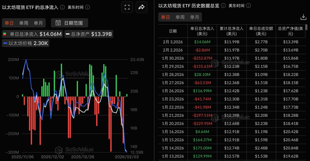 SoSoValue 데이터에 따르면 이더 현물 ETF는 어제(2월 3일, 미국 동부시간) 총 1,405만 5,100달러의 순유입을 기록했습니다.