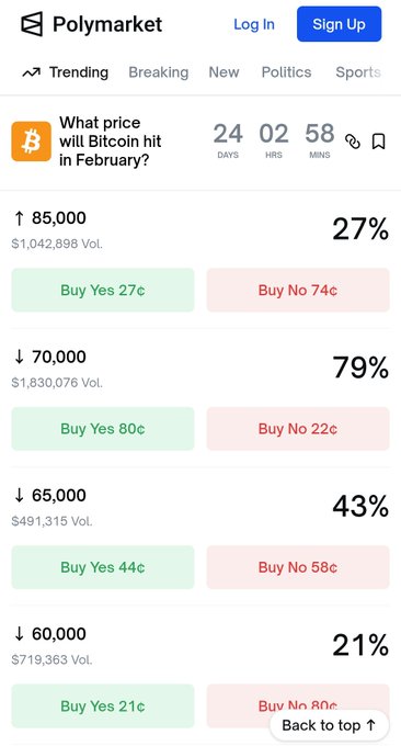 현재 폴리마켓(Polymarket)에 따르면 2월에 8만 5천 달러에 도달할 확률은 27%이고, 6만 5천 달러에 도달할 확률은 무려 43%입니다.