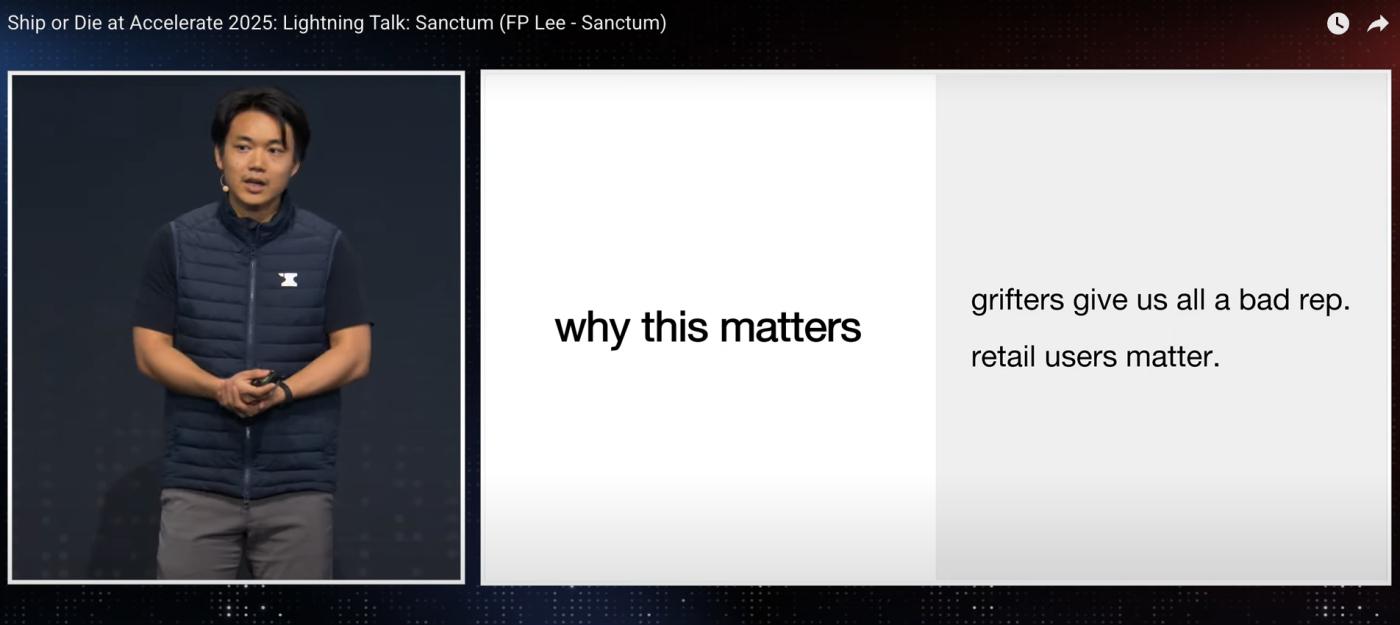 FP는 자신의 말을 행동으로 보여주는 몇 안 되는 창업자 중 한 명입니다. 매달 업데이트를 발표하고 디스코드에서 사용자들과 꾸준히 소통하는 등, 그는 커뮤니티 구축을 끊임없이 개선하고 열정을 쏟는 일로 여깁니다. 이러한 진정성은 시간이 지남에 따라 시너지 효과를 내어 사용자 기반을 더욱 강력한 "운동"으로 변화시킬 것입니다. 우리는 이것이 Sanctum의 가장 강력한 장기적인 차별화 요소 중 하나로 남을 것이라고 믿습니다.