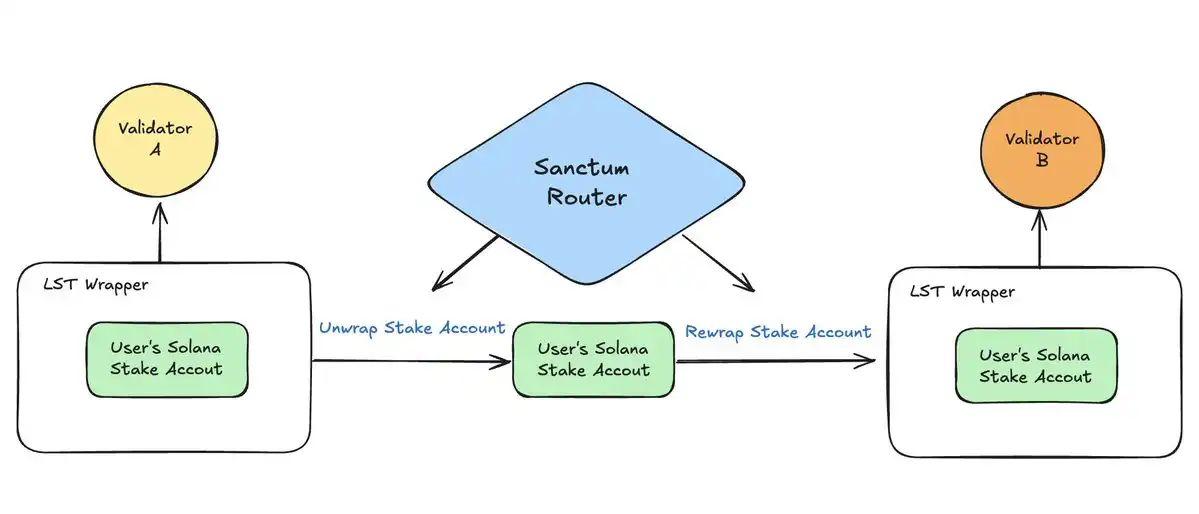 그들이 이 문제를 해결하기 위해 고안한 방법은 위에서 언급한 통찰력과 밀접하게 관련되어 있습니다. 첫째, 그들은 수천 개의 LST 간 교환을 위한 "Sanctum Router"를 개발했습니다. 이 교환은 기본 스테이킹 계정을 "풀고" "다시 묶는" 간단한 과정을 통해 이루어질 수 있습니다.