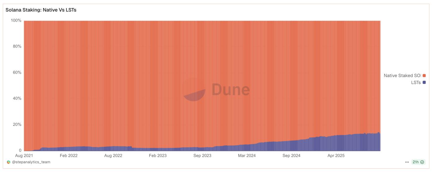 하지만 13.3%라는 낮은 스테이킹률은 대부분 스테이킹($SOL) 스테이킹 자산이 유동성이 부족하다는 것을 의미합니다. 이더 성숙한 시장(유동성 스테이킹 스테이킹률이 35~40%에 달함)과 비교해 볼 때, 자본 효율성과 구성 가능성을 극대화하는 핵심 요소인 솔라나의 유동성 스테이킹 레이어는 아직 초기 단계에 머물러 있습니다.