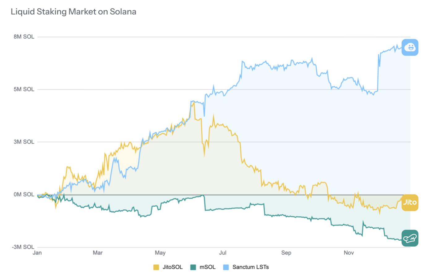 또 다른 주목할 만한 지표는 2025년 솔라나 LST(장기 저축 예금) 시장에서 Sanctum의 압도적인 지배력입니다. Sanctum은 누적 순유입액이 거의 8백만 SOL에 달한 반면, 주요 경쟁사인 Jito와 Marinede는 LST 상품에서 순유출을 기록했습니다. 이러한 격차는 LST 시장에서 Sanctum의 강력한 유동성 우위가 얼마나 큰지 보여줍니다.