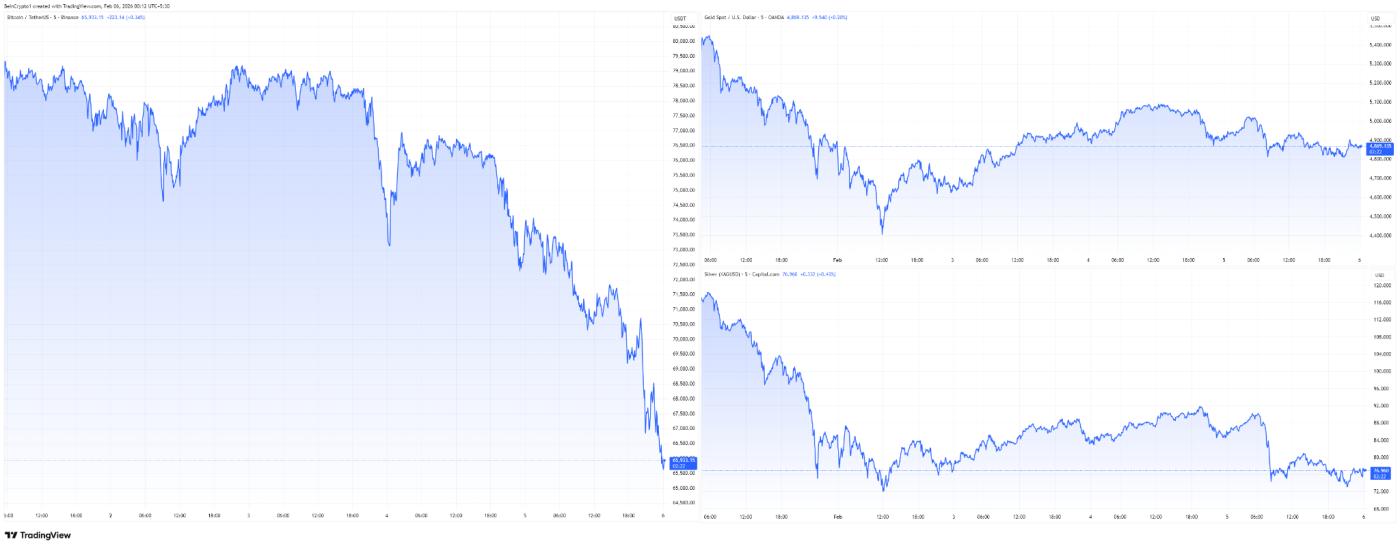 그러한 패턴은 일반적으로 레버리지 청산 시 나타납니다. 마진콜에 직면한 트레이더들은 비트코인, 금, 은을 포함한 유동성이 높은 자산을 먼저 매도합니다. 이러한 매도는 기계적인 행위이지 이념적인 행위는 아닙니다.