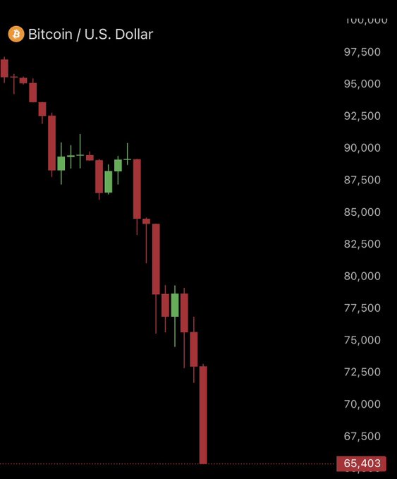 🚨 비트코인이 65,000달러 아래로 떨어졌고, 하루 만에 8,500달러나 하락했습니다.