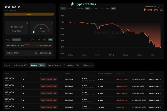 이 새로 생성된 지갑은 $ETH (20배) 롱 포지션에서 완전히 청산되어 단 3일 만에 404만 8천 달러의 손실을 입었습니다. app.coinmarketman.com/hypertra...…