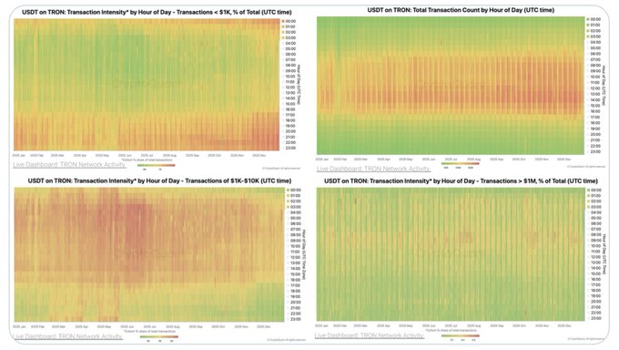 트론(Tron)의 USDT 총 공급량이 834억 달러에 달하며 이더리움을 제치고 1위를 차지했습니다! @cryptoquant_com에 따르면, @trondao에서 USDT는 단순히 거래 목적으로만 사용되는 것이 아닙니다. 아시아 및 미국 거래 시간대에는 1,000달러 미만 거래가 전체 거래의 약 60~74%를 차지하며, 이는 개인 간 결제 및 해외 송금 수요를 명확하게 보여줍니다. 반대로, 고액 거래는 EMEA(유럽-중동-아프리카) 거래 시간대에 급증하는 경향을 보이며, 이는 장외거래(OTC) 및 기관 투자자들의 자금 유입을 시사합니다. 이는 스테이블코인 활동이 더 저렴하고 빠른 결제 방식으로 이동하고 있음을 보여줍니다. #TRONGlobalFriends
