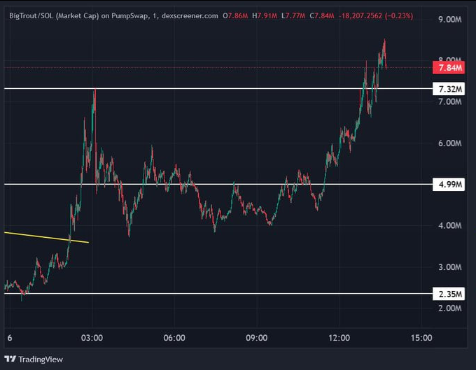 $BIGTROUT S/R flipped $5M MC range after breaking out into ATHs @ $7.5M MC