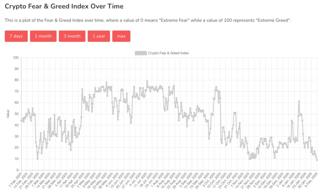 Alternative.me의 데이터에 따르면, 암호화폐 공포 및 탐욕 지수는 오늘 9로 하락하여(어제 12 "극심한 공포" 대비) 1년 만에 최저치에 근접했으며, 이는 시장이 "극심한 공포" 상태에 있음을 나타냅니다.