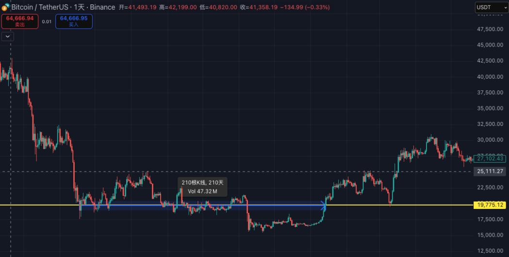 베어장 (Bear Market) 의 핵심 코인 이동과 스트레스 테스트 단계를 완료했다고 볼 수 있습니다. 이후 가격은 거래량 감소와 함께 장기간의 횡보세를 보였습니다. 2023년 초, 거시경제적 금리 인상 기대감이 둔화되고 시장이 새로운 시나리오를 모색하기 시작하면서 비트코인은 20,000달러 선을 회복하고 새로운 상승 사이클을 시작했습니다. 이는 비트코인 가격이 처음 20,000달러 아래로 떨어진 지 210일 만의 일이었습니다.