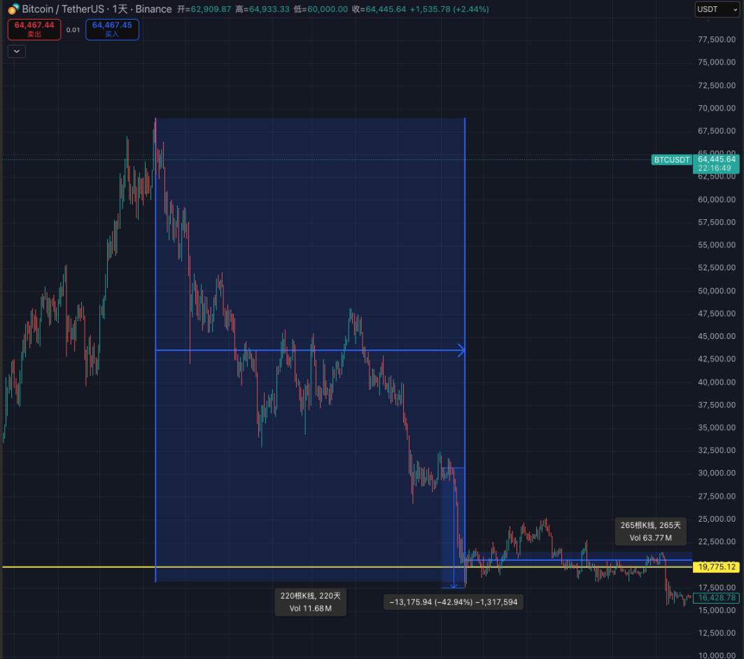 이번 가격 움직임은 이전 불장(Bull market) 의 고점을 돌파했습니다. 이러한 반복은 거시 경제 및 시장 환경의 변화와 관계없이 비트코인의 4년 주기가 여전히 진행 중임을 확인시켜주는 듯합니다. 2022년 2만 달러 아래로 떨어졌던 것처럼, 6만 9천 달러라는 중요한 심리적 저항선을 무너뜨린 것은 시장의 신뢰에 또 다른 타격을 주고 있습니다. 지난번 하락 이후에는 어떤 일이 벌어졌을까요? "배를 따라가 칼을 찾는" 전략에 어떤 통찰력을 얻을 수 있을까요? 저점매수 (바텀피싱) 해야 할까요?