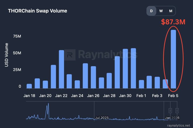 하루 만에 8730만 달러. 토르체인(THORChain) 시장 혼란의 한가운데서 상당한 거래량 처리했습니다. 변동성이 커지면 비허가형(Permissionless) 인프라가 제 역할을 해냅니다. (1/3) 🧵👇