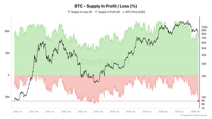 🔴 우리는 이전 약세장 당시의 손실 보유량 수준에 근접하고 있습니다. 2022년 11월에는 약 1,050만 비트코인(BTC) 손실 상태로 보유되었습니다. 💥 현재 950만 비트코인(BTC) 이상이 손실을 보고 있으며, 약 1,040만 비트코인(BTC) 수익을 내고 있습니다. 손실을 보고 있는 비트코인과 수익을 내고 있는 비트코인(BTC) 양이 거의 같아지는 시점에 가까워지고 있는데, 이는 2022년 약세장 막바지에 마지막으로 발생했던 상황입니다. 조정이 매우 심각하여 손실을 감수하고 보유한 공급량이 매우 빠르게 증가했다는 점에 주목할 필요가 있습니다.