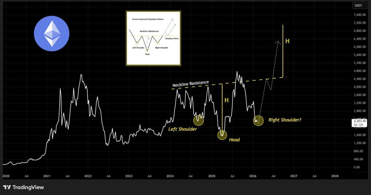 시장 분석업체 비트코인센서스가 공유한 트레이딩뷰 스냅샷 에 따르면, 이더리움의 주간 차트에서 역헤드앤숄더 패턴이 형성되고 있는 것으로 나타났습니다. 이 패턴은 장기간 하락세 이후 형성되며, 2024년 중반에 왼쪽 어깨를, 2025년 초에 더 깊은 저점을 형성하며 머리를, 그리고 2026년 초에 반등하여 오른쪽 어깨를 형성할 가능성이 있습니다.