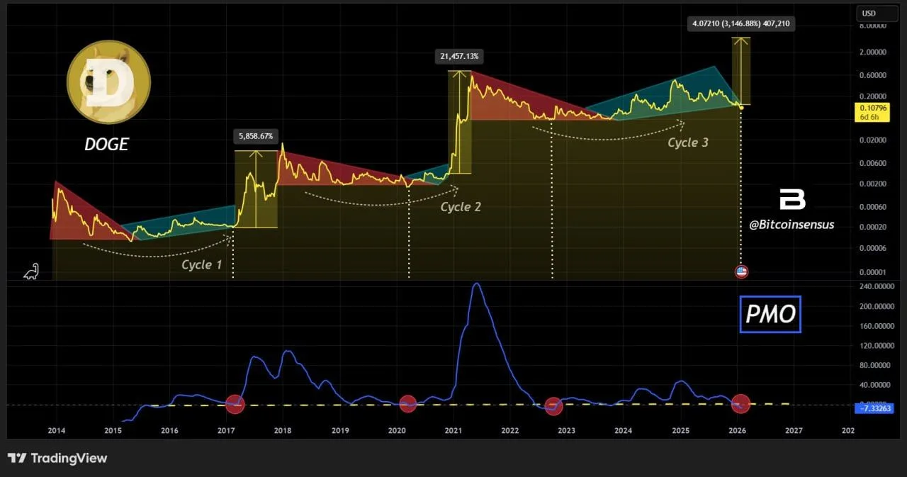 이 차트는 도지코인의 과거를 여러 사이클로 나누고, 각 사이클의 저점을 기준선 아래의 유사한 PMO 하락 과 연결합니다. 이러한 시점은 가격이 하락 추세를 멈추고 이후 상승 움직임에 앞서 평탄한 바닥을 형성했던 시기와 일치합니다. 따라서 이 지표는 현재 영역을 새로운 하락세의 시작이 아닌 하락세의 후반 단계로 해석할 수 있게 합니다.