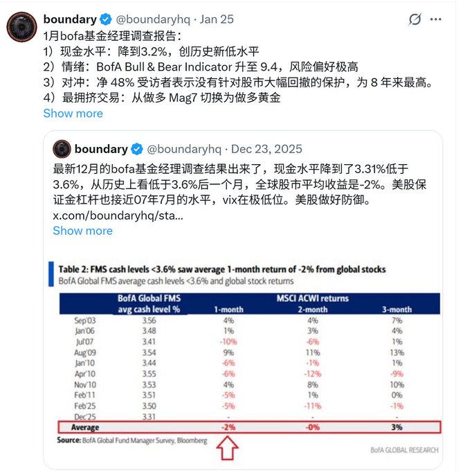 1월에 발표된 BOFA 펀드매니저 설문조사 보고서에 따르면 현금 보유 비중이 3.2%로 역대 역대 신저점.