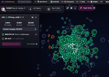 $SOBAT (CA EW7cWbNmTgL7PLQNiJ6tBVC62SJzJXa2pFYJjDPPpump)에는 스나이퍼나 내부자가 없으며, 팀은 1%의 지분을 보유하고 있습니다(999일 동안 락업). Cryptoplug420, David, Bobo | ChainGang, kk🎒, endlesssummer.sol가 주요 보유자입니다. 버블맵에서 뚜렷한 클러스터는 발견되지 않았습니다. 중앙화 거래소(CEX) 맵 클러스터가 59%를 차지하며, 바이낸스 자금 지원 지갑이 26.2%, 코인베이스가 18.9%, 멕시코 거래소 (엠이엑스씨(MEXC) 5.2%, 체인지 나우(Change Now)가 1.4%입니다. 상위 70명 보유자가 52.4%를, 상위 10명이 14.2%를 보유하고 있으며, 평균 보유량은 2,680명으로 총 2,680명이 230달러에 매입했습니다. (NFA)