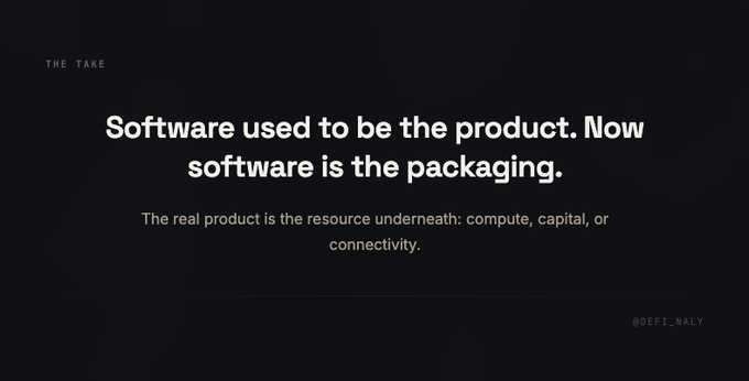 12/ 과거에는 소프트웨어가 제품이었지만, 이제는 소프트웨어는 포장재일 뿐입니다. 진정한 제품은 그 아래에 있는 자원, 즉 컴퓨팅 능력, 자본 또는 연결성입니다.