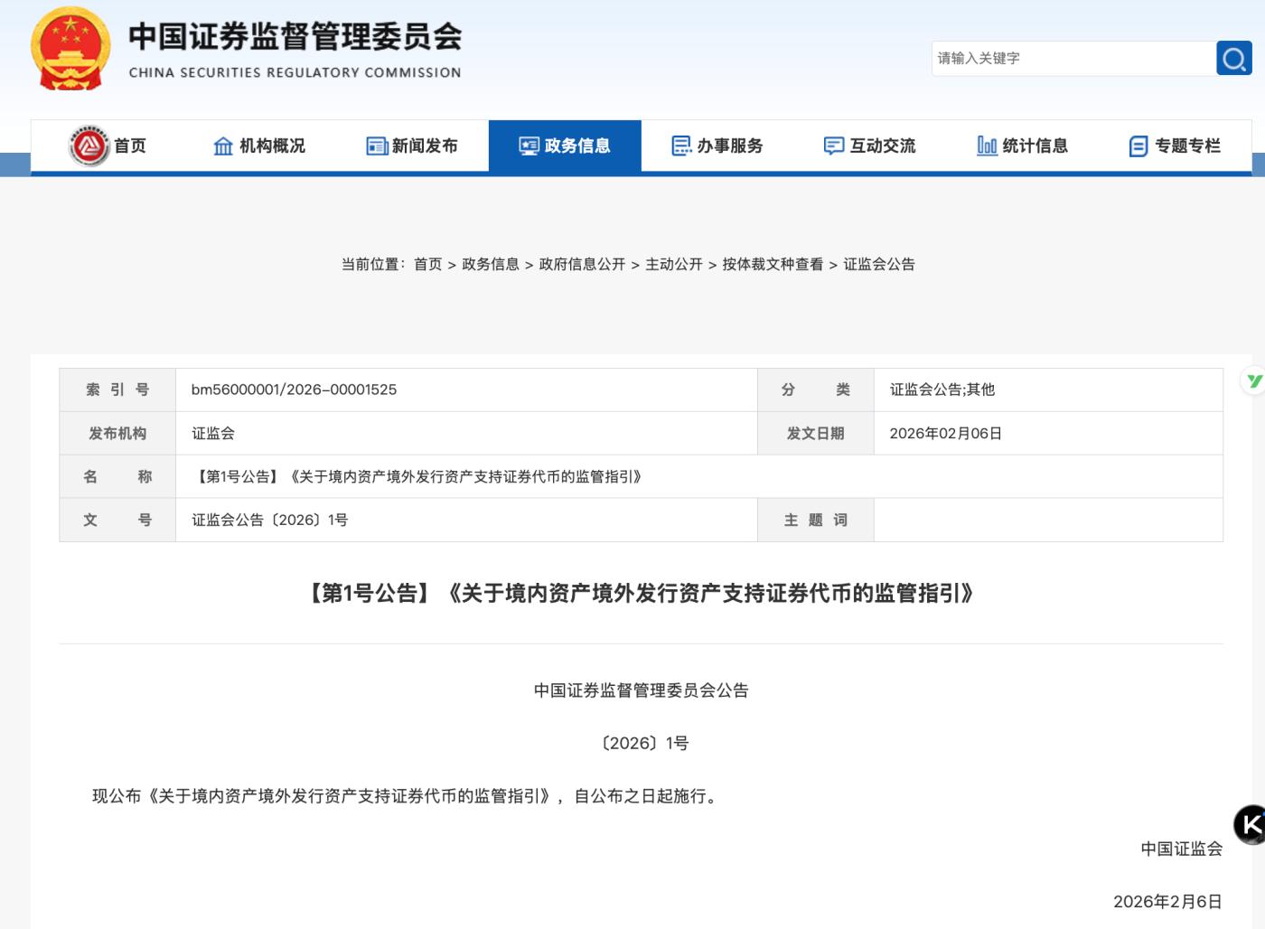 2026년 2월 6일, 중국 인민은행을 비롯한 8개 부처가 공동으로 발표한 "가상화폐 관련 리스크 예방 및 관리 강화에 관한 통지"(인파[2026] 제42호, 이하 "문서 제42호")와 중국 증권감독관리위원회가 동시에 발표한 "국내 자산을 이용한 해외 자산담보부증권 토큰 발행에 관한 규제 지침"(이하 "지침")은 법조계와 금융계에 큰 파장을 일으켰다.