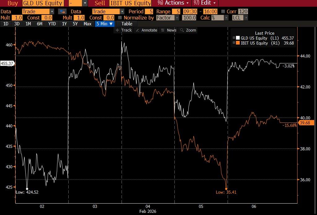 한편, 지난 몇 주 동안 IBIT의 가격 움직임과 소프트웨어 주식 및 기타 리스크 자산 간에 매우 강한 상관관계가 관찰되었습니다 . 골드만삭스의 프라임 업무(PB) 팀은 2월 4일이 멀티 전략 펀드 역사상 최악의 하루 실적 중 하나였으며, Z-점수가 3.5에 달했다는 보고서를 발표했습니다. 이는 발생 확률이 0.05%에 불과한 극단적인 사건으로, 3시그마 사건(일반적인 "블랙 스완" 기준, 발생 확률 약 0.27%)보다 10배나 드문 현상입니다. 이는 재앙적인 충격으로 묘사될 수 있습니다. 일반적으로 이러한 사건 이후에는 멀티 전략 펀드(팟샵)의 리스크 관리자들이 신속하게 개입하여 모든 트레이딩 팀이 즉각적이고 무차별적으로 레버리지를 급히 줄이도록 요구합니다 . 2월 5일 역시 대규모 하락장이 된 이유가 바로 여기에 있습니다.