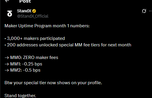 StandX, Maker Uptime 보상 첫 달 사용량도 엄청나네요. Infofi 보상 캠페인은 끝난 것 같고 이제 모든 보상은 사용량 기반으로 바뀌는 것 같아요 (당연하죠).