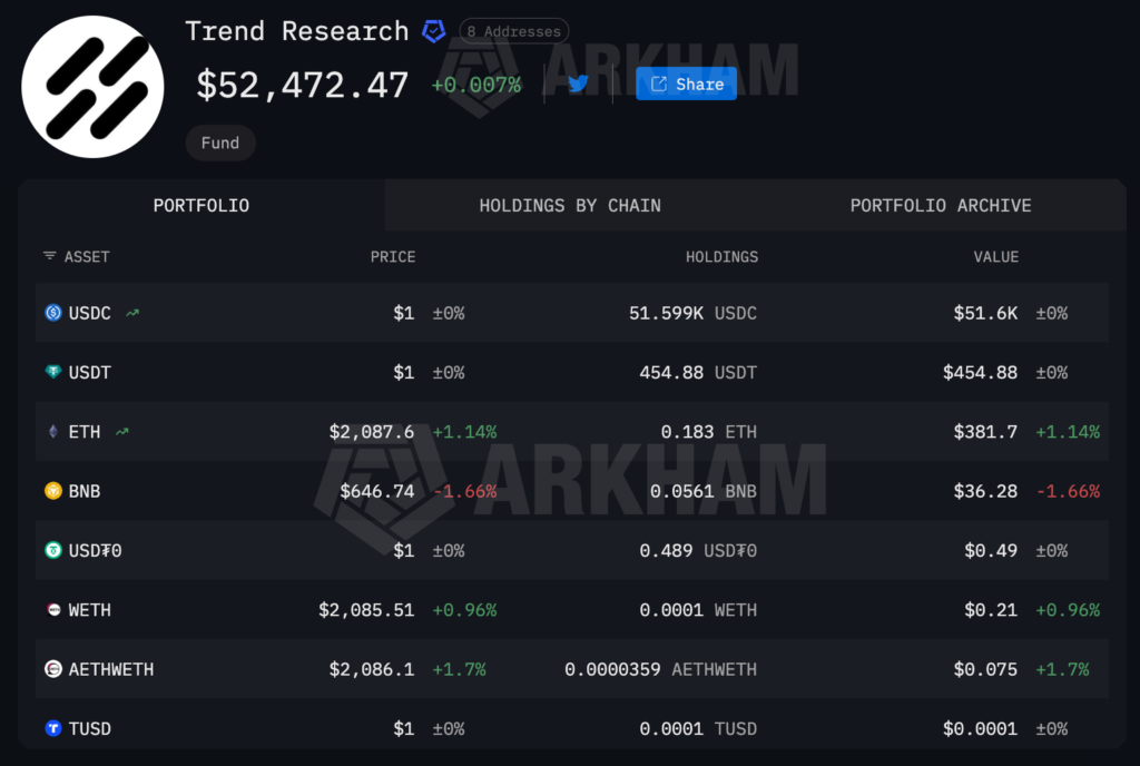 오늘 아침, 온체인 분석 플랫폼 아캄(Arkham)은 이리화(Yi Lihua) 소유의 트렌드 리서치(Trend Research)가 마지막 남은 약 534 ETH(약 111만 달러 상당)를 바이낸스로 이체한 것을 확인했습니다 . 이 거래 이후, 한때 65만 이더 이상을 보유하고 20억 달러 규모의 포트폴리오를 운용했던 해당 주소의 잔액 이제 단 0.18 ETH로 줄어들었습니다.