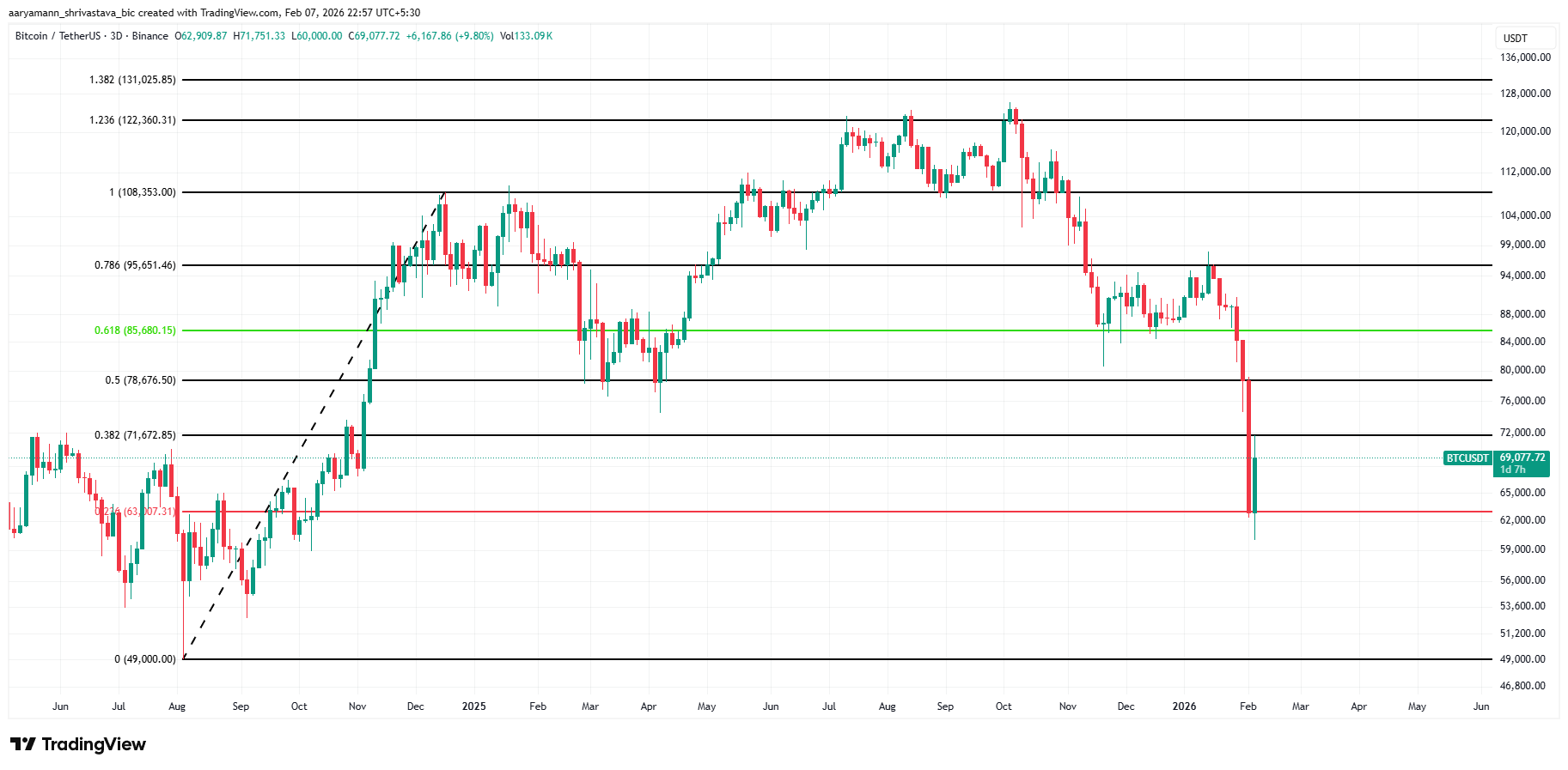 현재 비트코인 가격은 최근 급락장에서 63,007달러 지지선을 반등한 후 69,077달러 부근에서 거래되고 있습니다. 공격적인 하락 매수세 덕분에 60,000달러까지 더 떨어지는 것을 막을 수 있었습니다. 이러한 방어선은 적어도 숏 으로는 저가에서 강력한 수요가 존재함을 보여줍니다.