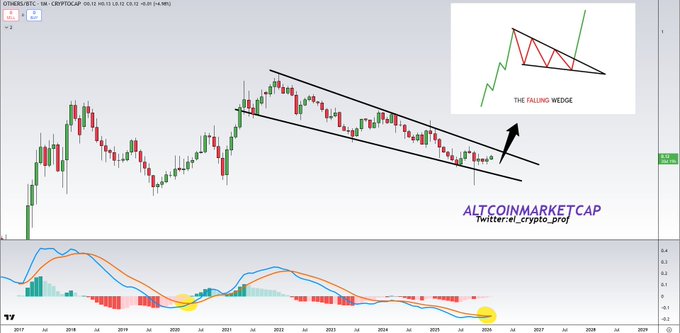 #알트코인 MACD에서 OTHERS/ 비트코인(BTC) 마지막으로 상승 크로스를 기록한 것은 2020년이었습니다. 그 시점부터 알트코인이 몇 달 동안 선두를 차지하며 비트 비트코인(BTC) 능가하는 성과를 보였습니다. 또한, 4년 반 동안 하락 쐐기 돌파 직전에 있는 것을 볼 수 있습니다.👀🔥