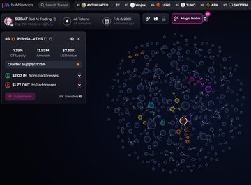$SOBAT (CA EW7cWbNmTgL7PLQNiJ6tBVC62SJzJXa2pFYJjDPPpump) 아직 스나이퍼나 내부자는 없으며, 1%는 998일 동안, 또 다른 1%는 26일 동안 락업되어 있습니다. Cryptoplug, crypto_hl, kk🎒, endlesssummer.sol가 주요 보유자입니다. 버블맵에서 뚜렷한 클러스터는 발견되지 않았습니다. 중앙화 거래소(CEX) 맵 클러스터가 56.7%를 차지하며, 바이낸스 자금 지원 지갑이 24.9%, 코인베이스가 14.9%, 엠이엑스씨(MEXC) )가 8.2%(높음), Change Now가 1%입니다. 상위 70개 홀더 58.8%를, 상위 10개 보유자가 14.2%를 차지하며, 평균 보유자 수는 2,210명이고 평균 보유 가격은 95달러입니다. (NFA)