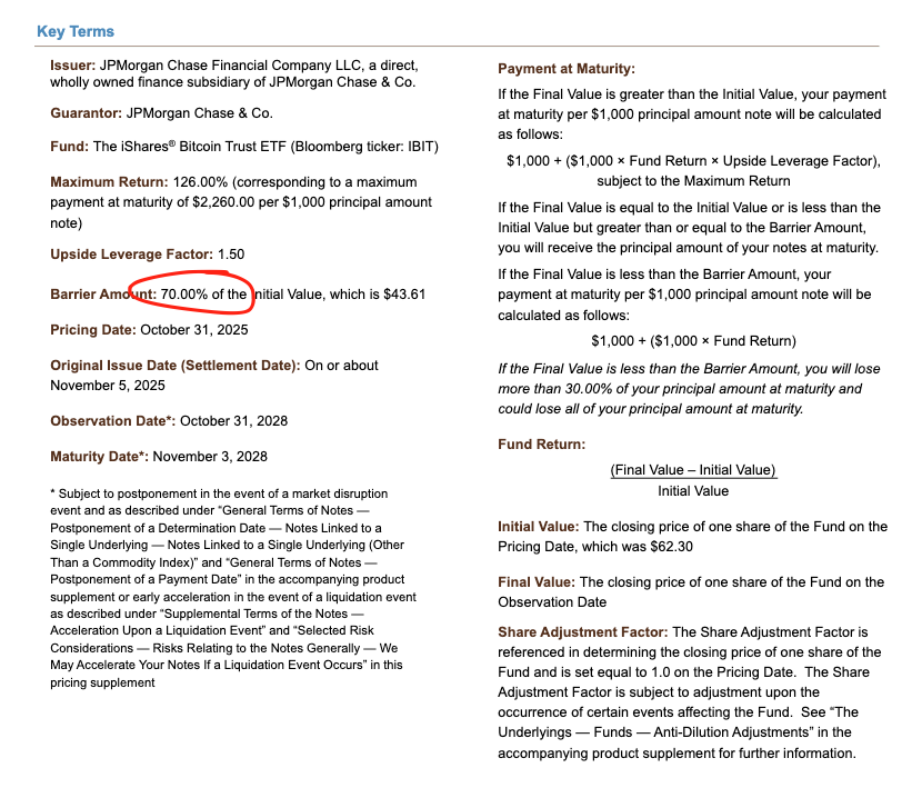 이로써 세 번째 요점으로 넘어갑니다. 광범위한 디레버리징 과정에서 IBIT가 매도된 메커니즘을 이해했으니, 이제 하락세를 가속화한 요인은 무엇일까요? 이러한 하락세를 부추긴 잠재적 요인 중 하나는 구조화 상품입니다. 구조화 상품 시장 규모가 이러한 매도세의 전적인 원인이라고 생각하지는 않지만, VaR 모델로는 예측할 수 없는 기묘하고도 완벽한 상황이 겹치면서 급격하게 연쇄적인 청산 반응을 일으키는 사건이 될 가능성은 충분히 있다고 봅니다.