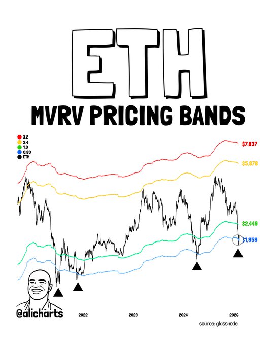 이더리움(Ethereum $ETH) 가격이 0.80 가격 밴드 아래로 세 번 하락했을 때, 이는 시장 바닥을 나타냈습니다. 가격이 1,959달러 아래로 떨어지면서, 그 신호가 다시 나타나고 있습니다.