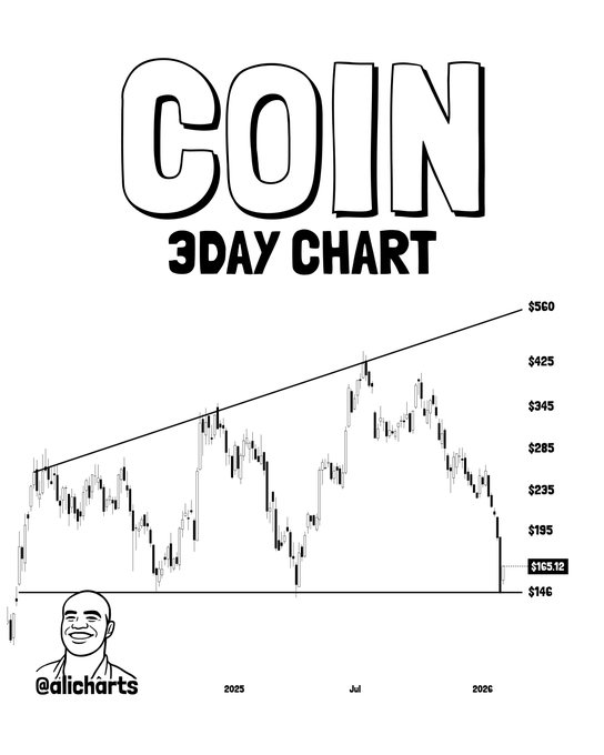 Coinbase $COIN는 직각 상승 확장형 쐐기형 패턴을 형성하는 것으로 보입니다. $146는 반등 또는 하락을 결정짓는 핵심 레벨입니다.
