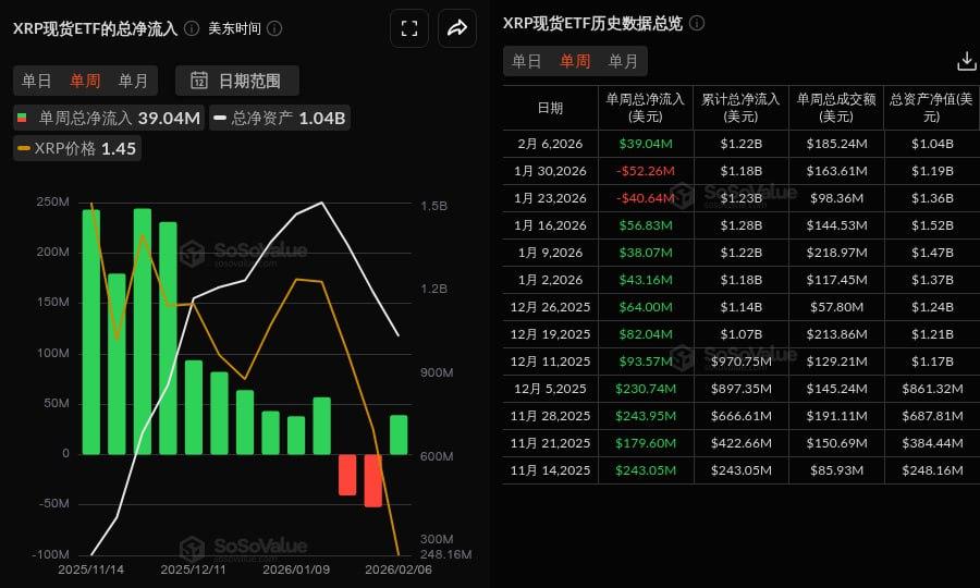 ME News에 따르면, SoSoValue 데이터에 의하면 2월 9일(UTC+8) 기준 XRP 현물 ETF는 지난 거래 주간(미국 동부시간 기준 2월 2일~2월 6일) 동안 3,904만 달러의 순유입을 기록했습니다.