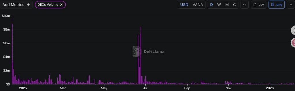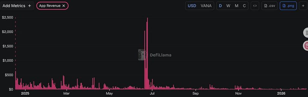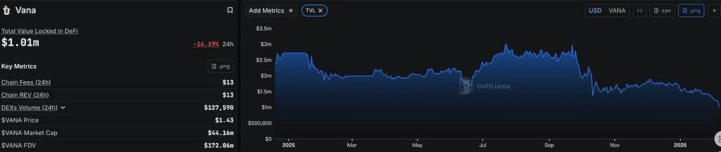 - TVL 감소: Vana의 총 예치 자산(TVL)이 초기 297만 달러에서 101만 달러로 급락(-65.99%)하여 지속적인 자본 유출과 사용자 이탈을 나타내고 있습니다.
