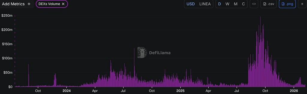 - 극심한 거래 침체: 일일 탈중앙화 거래소(DEX) 거래량이 약 8만 달러라는 저조한 수준에 머물러 있으며, 이는 온체인 활동의 심각한 부족과 사용자 참여의 미미함을 반영합니다.