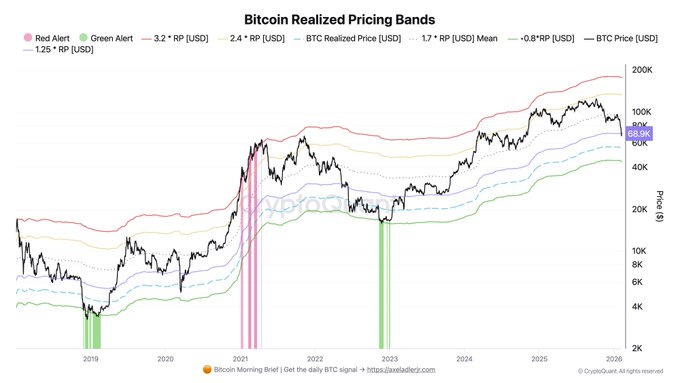 비트코인 가격은 최고점 대비 46% 하락했습니다. 이번 약세장은 심화 국면에 접어들었습니다. 가격이 실현 가격의 1.25배 구간(역사적으로 조정과 전부 매도(Capitulation) 기준선)을 시험하고 있습니다. ☕️애들러 AM #101 👇 axeladlerjr.com/drawdown-46-be...…