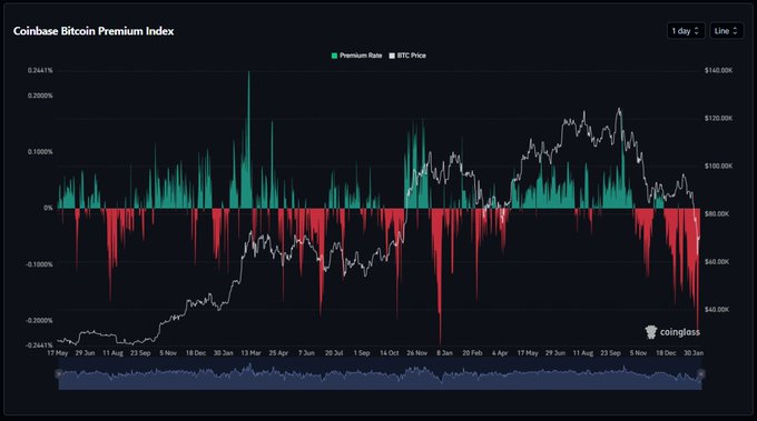 코인베이스 프리미엄이 1년 만에 최저 수준 중 하나를 기록했습니다! 이는 미국 시장의 강력한 매도 압력을 시사하며, 비트코인이 지속적인 하락세를 보일 가능성을 시사합니다.