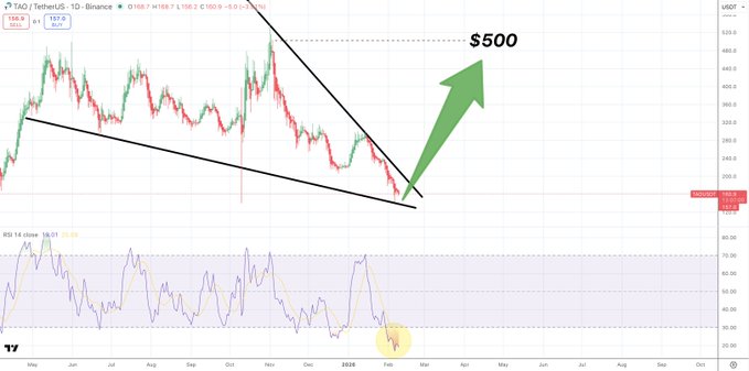 $TAO/ 테더 USDT(USDT) 일일 $TAO 데일리는 정말 놀랍습니다. 이런 기회가 몇 번이나 오겠어요? 가격이 사상 최저치를 기록하고 RSI가 토큰 역사상 최저 수준으로 하락 쐐기 패턴이 나타났습니다 🎯🎯🎯 돌파구에서 이지 3배 수익