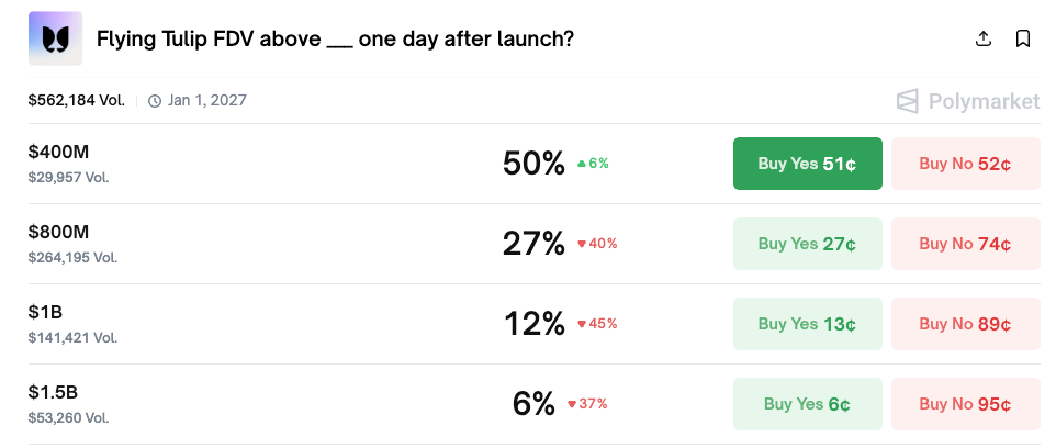 플라잉 튤립은 토요일에 매각 날짜를 확정했으며, 예측 시장에서는 거래량은 적겠지만 플랫폼의 완전 희석 시가총액(FDV)이 4억 달러를 넘어설 확률을 50대 50으로 보고 있습니다.
