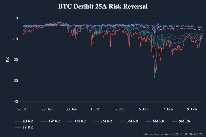 변동성이 급격히 상승하여 1주일 만기 내재 변동성은 103.8 vols(장중 약 82% 상승)까지 치솟았고, 1개월 만기 내재 변동성은 51에서 80.8 vols로 상승했습니다. 1주일 만기 25 델타 리스크 리버설은 2022년 11월 이후 최저 수준으로 급락했으며, 1개월 만기 왜곡 리스크 리버설 또한 약 -29 vols까지 떨어져 하락 헤지 수요 증가를 반영했습니다.