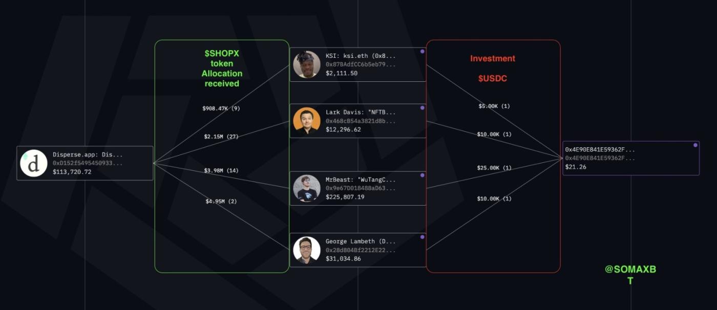 SomaXBT에 따르면, MrBeast는 해당 프로젝트에 10만 달러를 투자하고 그 대가로 100만 개의 SUPER 토큰을 받았습니다. 그의 투자 이후 토큰 가격이 급등했고, 2021년 3월 30일 MrBeast는 자신의 SUPER 토큰을 백업 지갑으로 옮긴 후 여러 차례의 거래를 통해 총 1,900 ETH(당시 환율로 약 370만 달러)에 매도했습니다. MrBeast는 베스팅 계약에 따라 추가 SUPER 토큰을 받았고, 이를 다시 매도하여 550만 달러에 판매함으로써 해당 프로젝트를 통해 총 약 900만 달러의 수익을 올렸습니다.