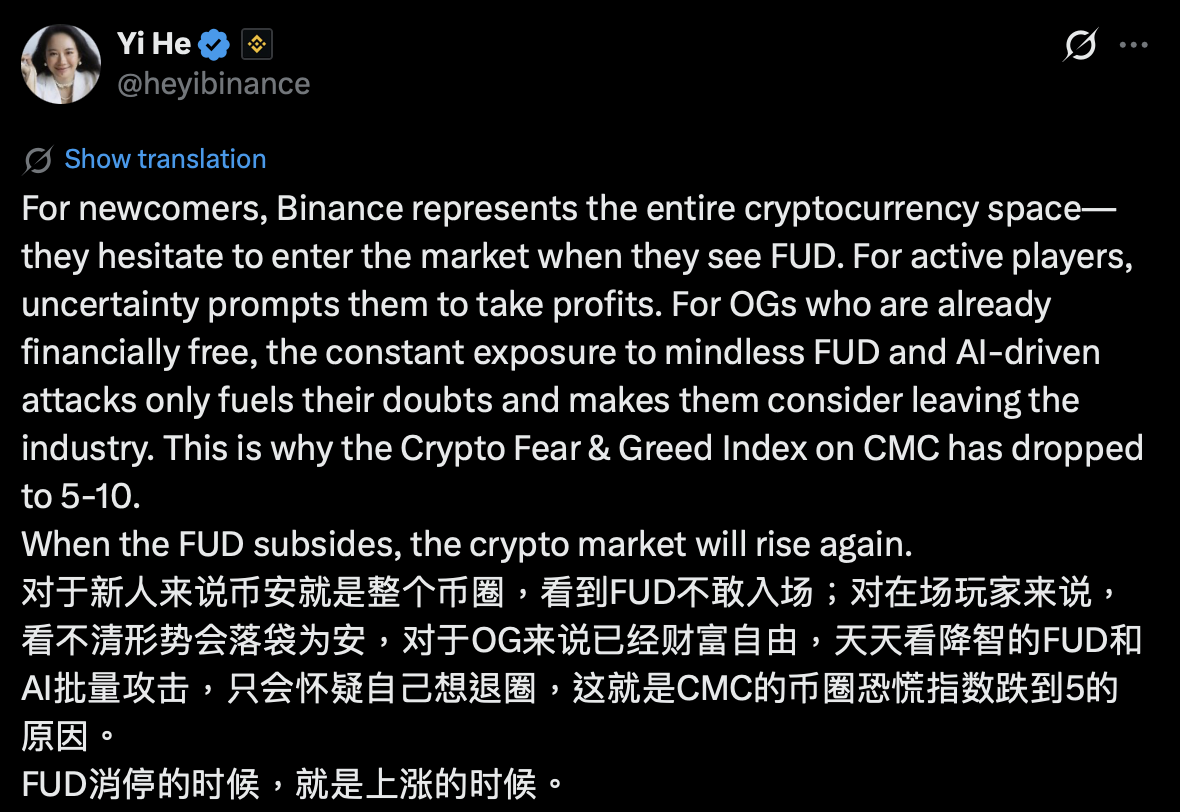 바이낸스 공동 CEO인 허 이 (He Yi) 는 2월 10일 기고문에서 최근 바이낸스를 둘러싼 공포, 불확실성, 의심(FUD)이 암호화폐 시장 전반의 정서 에 다양한 방식으로 영향을 미치고 있다고 지적했습니다. 그녀는 또한 이러한 정서 변화가 코인마켓캡의 암호화폐 공포 및 탐욕 지수가 5~10 수준으로 하락한 것과 관련이 있다고 분석했습니다.