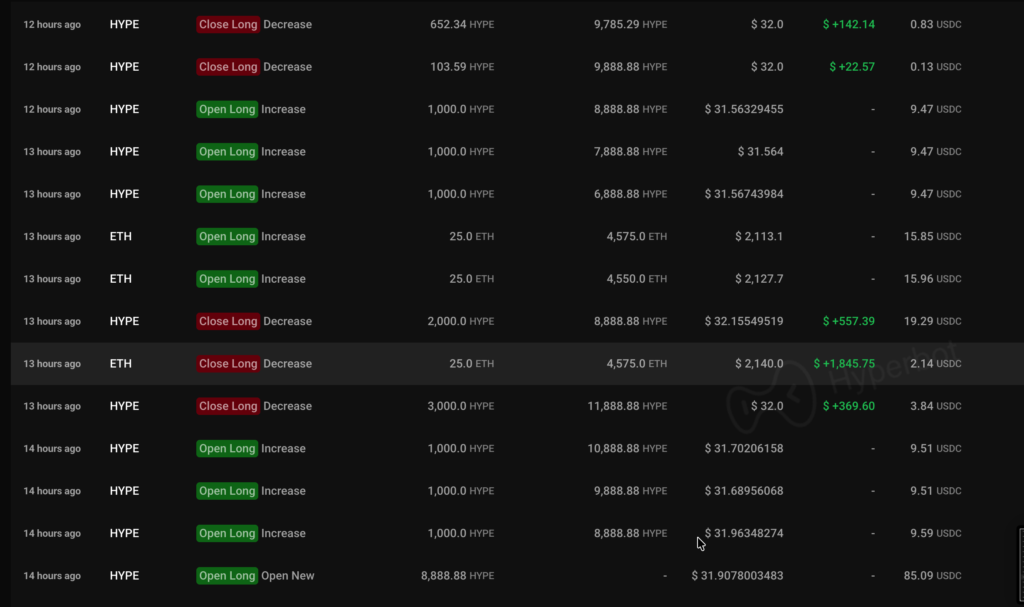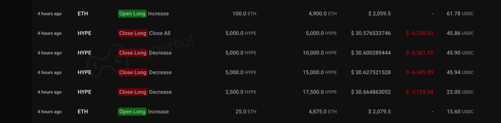 이더리움(ETH)뿐만 아니라, 황리청(Huang Licheng)의 하이퍼리퀴드(Hyperliquid) 네이티브 토큰인 하이프(HYPE) 롱(Long) 포지션 도 손실을 입었습니다. 모니터링 데이터에 따르면 그는 어젯밤 새벽 1시경부터 하이프 롱(Long) 을 지속적으로 포지션 진입 포지션 최대 17,500개까지 치솟았습니다. 그러나 오늘 이더리움 매도세가 시작되기 약 4시간 전, 황리청은 하이프 포지션 과감하게 청산하며 22,857달러의 손실을 기록했습니다.