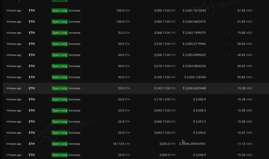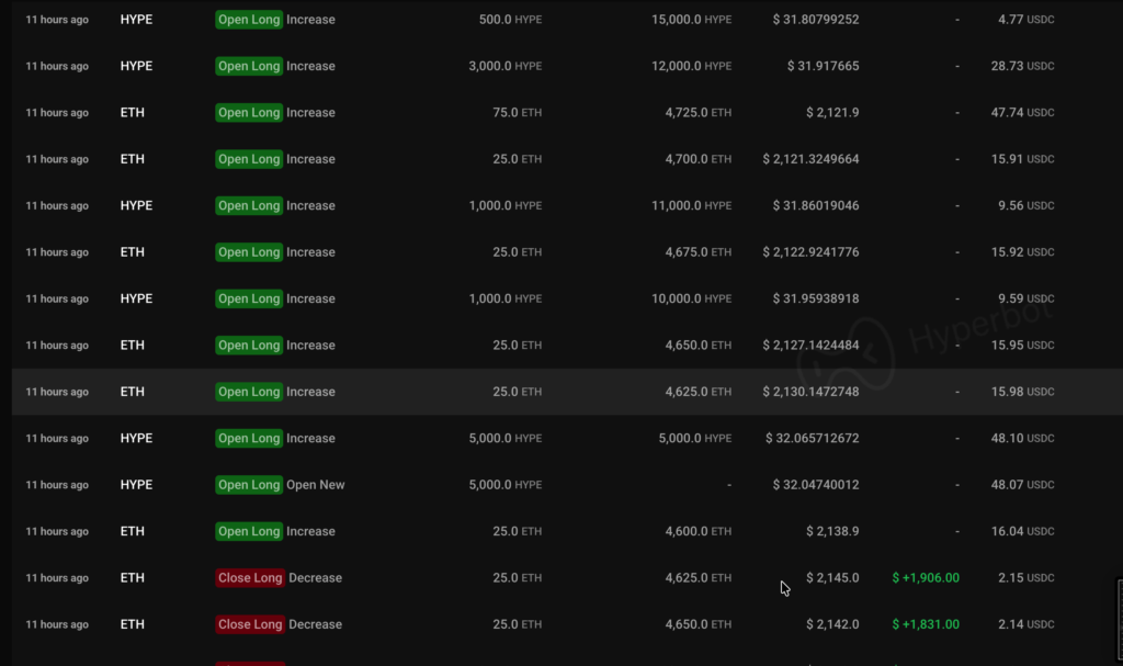 흥미로운 점은 황리청이 이 글을 쓰는 시점 이후로 잠을 거의 자지 않은 것으로 보인다는 것입니다. 그는 2월 9일 저녁부터 2월 10일 오후까지 2시간 간격으로 시장을 계속 모니터링했습니다. 그는 진입 및 청산 전략을 끊임없이 시험했고, 수익이 발생한 후에만 HYPE와 ETH 포지션 늘리기(물타기) 추가했습니다. 그러나 결과는 만족스럽지 못했고, 누적 손실액은 2,550만 달러를 넘어섰습니다.